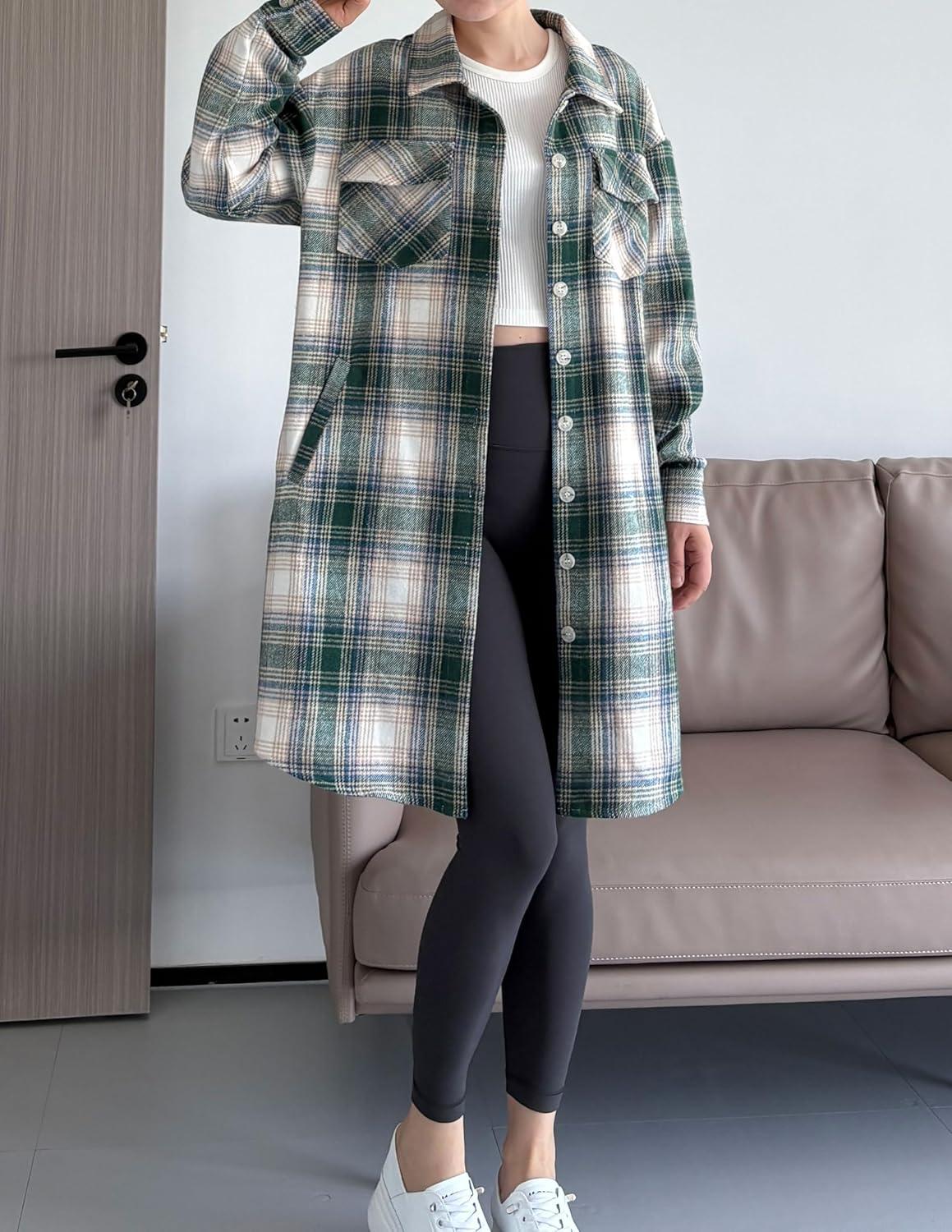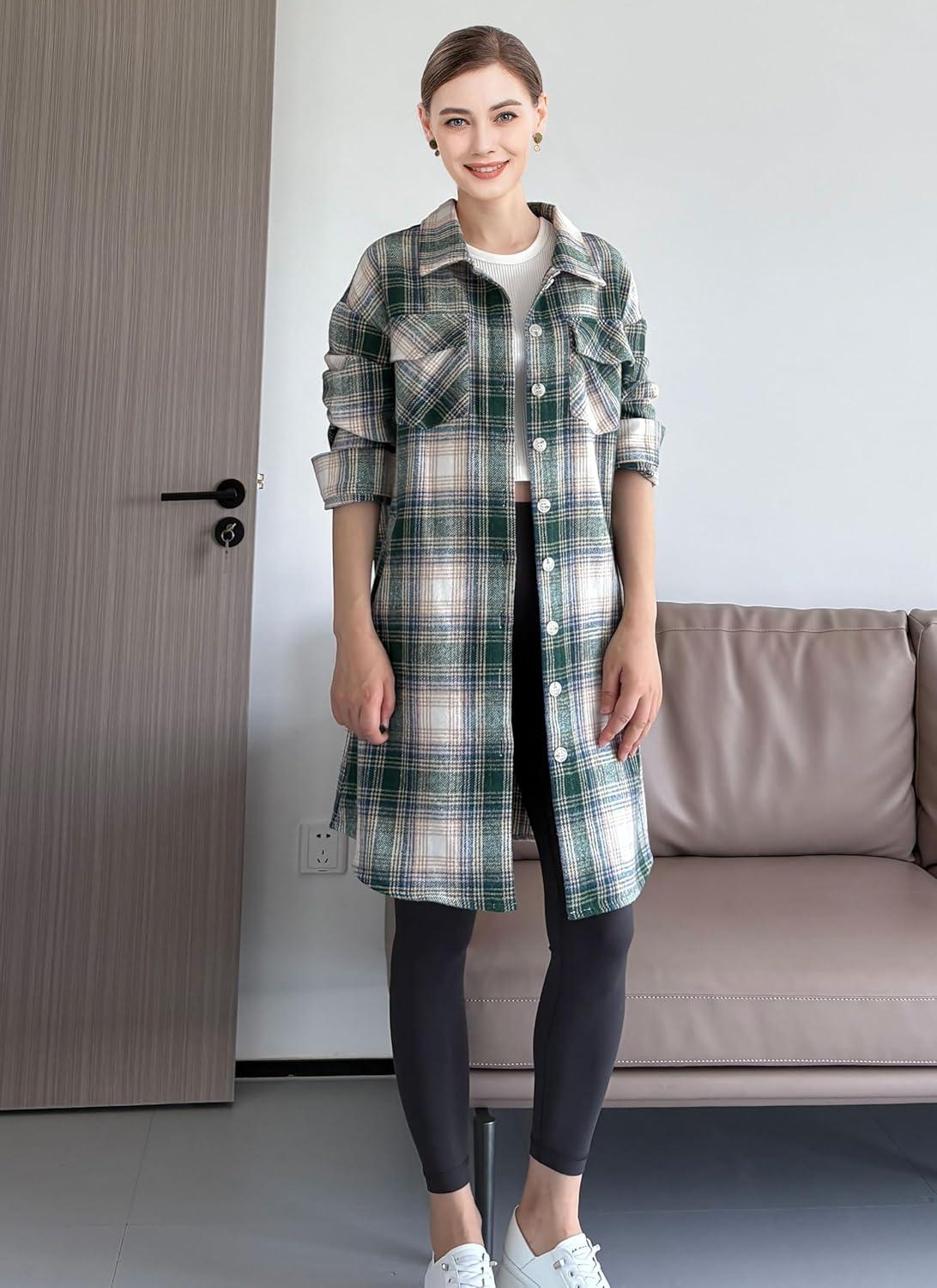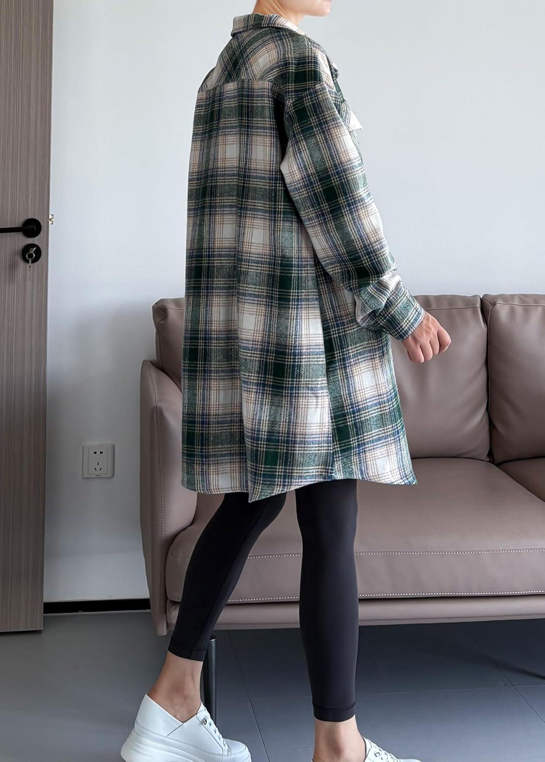 Minibee Women's Flannel Shirt Jacket Plaid Long Sleeve Shacket Button Down Blouses Tops with Pockets(Green)