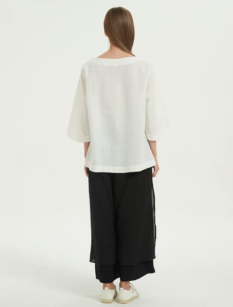 imageMinibee Womens Linen Blouse Round Neck 34 Sleeve Shirt Tops with Chinese Frog ButtonBlack